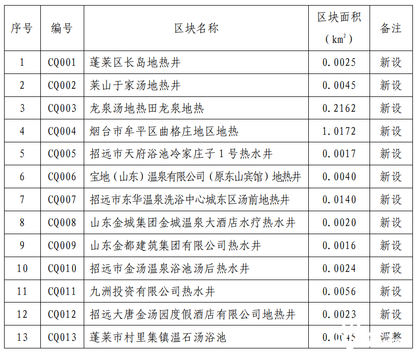 規(guī)劃期內,共設置地熱勘查區(qū)塊2處,分別為山東省棲霞市惠禾·艾山地區(qū)地熱普查和山東省棲霞市長春湖·霞光地區(qū)地熱普查,投放時間為2022年。規(guī)劃地熱重點開采區(qū)1處,位于招遠市東湯地熱田。重點開采區(qū)內要嚴格按照開采規(guī)劃區(qū)塊優(yōu)先投放采礦權,鼓勵支持礦山企業(yè)整合重組,優(yōu)化開發(fā)布局,提高資源利用效率。