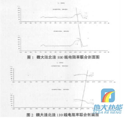 (1)魏大洼100線電阻率聯(lián)合剖面沿東西向布設(shè)。當(dāng)AO= BO=70m,聯(lián)剖曲線ρsA與ρsB兩線在1010點(diǎn)處為正交點(diǎn); 改變極距、AO=BO=130m后, 聯(lián)剖曲線ρsA與ρsB兩線在1020點(diǎn)處為正交點(diǎn);說明該地層構(gòu)造產(chǎn)狀較陡并向東傾斜。向南100米與100線平行布置110線,當(dāng)AO=BO=70m,聯(lián)剖曲線ρsA與ρsB兩線在1105點(diǎn)處為正交點(diǎn);改變極距、AO=BO=130m后,聯(lián)剖曲線ρsA與ρsB兩線在1110點(diǎn)處為正交點(diǎn);說明該地層構(gòu)造近似南北向(見圖1~2)。