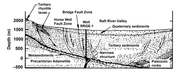 拉夫特河地?zé)崽?/a>的熱儲(chǔ)層,處在一個(gè)盆地中,這個(gè)盆地西部以一個(gè)小角度的斷層為界限,東邊則是由黑松山(Black Pine Mountains)和一個(gè)二次斷層分界。熱儲(chǔ)的蓋層為第三系的沉積層,基底巖石大約厚度為1600m,在這個(gè)深度被一個(gè)東北向的線性構(gòu)造—解理構(gòu)造(Narrows Structure)所貫穿,人們認(rèn)為這個(gè)結(jié)構(gòu)是基底剪切作用產(chǎn)生的。熱源為前寒武紀(jì)二長(zhǎng)花崗巖。開(kāi)始,人們認(rèn)為熱液是通解理構(gòu)造涌上來(lái),然后通過(guò)其他的褶皺和斷層蔓延整個(gè)沉積構(gòu)造?,F(xiàn)在的人們則認(rèn)為有兩個(gè)熱源補(bǔ)給區(qū),一個(gè)來(lái)自西北方向沿著馬井?dāng)鄬臃植嫉难a(bǔ)給區(qū),另外一個(gè)則是來(lái)自東南方向的,可能是與變窄構(gòu)造有關(guān)聯(lián)。