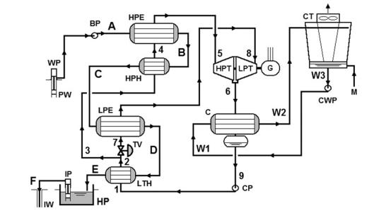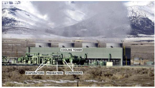 最新的USGeo拉夫特河發(fā)電站坐落在起初的電站南南東方向約600m的地方。這個(gè)最新的發(fā)電機(jī)組的能量對(duì)流系統(tǒng)是一個(gè)部分回?zé)?,二?jí),雙壓力雙循環(huán)發(fā)電機(jī)組。有兩個(gè)單獨(dú)的單元,每一個(gè)單元都有兩個(gè)軸向流動(dòng)的渦輪來(lái)驅(qū)動(dòng)同一個(gè)中心發(fā)電機(jī)。一個(gè)四室的水冷卻塔為殼管冷凝器(shell-and-tube condensers)提供冷卻提供冷卻水。補(bǔ)充水是從水井中獲取的,而且需要及時(shí)處理來(lái)維持冷卻塔中的水的質(zhì)量。138℃的鹵水以大約3.15×106kg/s的速度泵向蒸發(fā)器和預(yù)熱器,循環(huán)工質(zhì)異戊烷(i-C5H12)就是在蒸發(fā)器和預(yù)熱器中吸收溫度的。換熱器只在高壓循環(huán)中才使用。