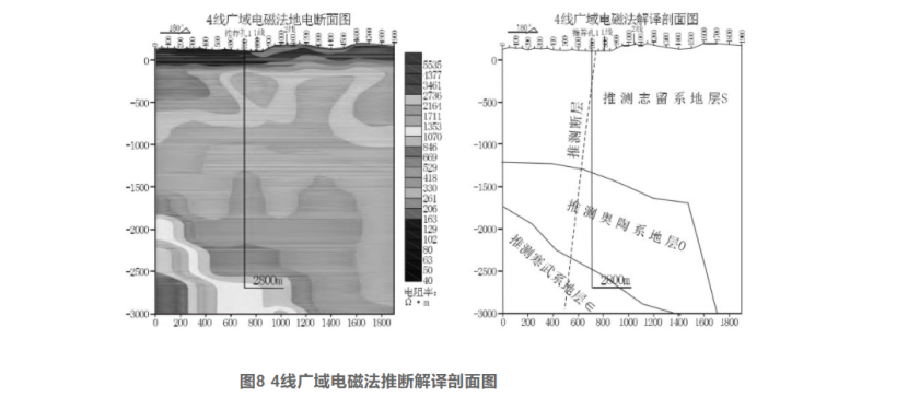 (3)各地層厚度及電阻率特征,志留系(S)地層電阻基本小于500Ω·m,厚度900-1800m;奧陶系O地層電阻率400~900Ω·m,厚度大于300 m,向南西側(cè)厚度急劇增大;寒武系∈地層電阻率基本大于900Ω·m,根據(jù)斷裂構(gòu)造發(fā)育、裂隙發(fā)育等因素影響呈現(xiàn)不同電阻率,厚度未揭穿。